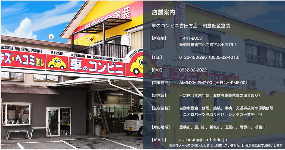 愛知県豊橋市にある「車のコンビニ」朝倉鈑金塗装はスピーディーな対応と長年培った技術力、そして地域に根ざした良心的な価格設定が自慢です!豊橋市、豊川市、新城市、田原市、湖西市に対応しています。